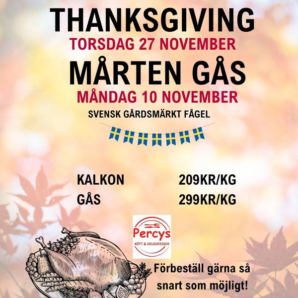 Vi på Percys Kött erbjuder både svensk Gås till Mårten Gås och saftig Kalkon till Thanksgiving.